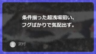 釣行記:沢村 連荘釣行、今日もフグまみれ、気配出なかった。 今日は潮回りが良いので連荘釣行。候補は浅場か深場。また潮位偏差がマイナスになり、浅場へ行ってみて状況判断して場所を決めるつもり。浅場へ到着するとやはり潮位は低い 2025.09.22 0 釣行記:沢村