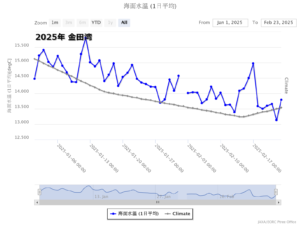 水産技術センターのリアルタイム海況データで過去1ヶ月分の推移は見られる、けれどもっと前のデータも見たい。