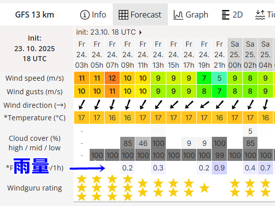 停滞前線があると天気予報が当たらないですね。アメリカのGFSの予報では雨を付けていたんですよね、そっちを無視してしまいました。