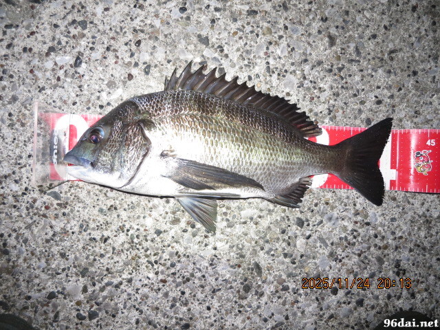 フグも少ないので、20:10少量持参のオキアミに変更したらアタリ、フグかゴンズイと思っていたら急に力強い走りに・・40cm 1.kgの黒鯛でした。40cmの割には力は弱く、鱗も黒々、細身体型、地付きの黒鯛でした。
