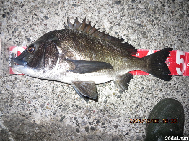 コマセは一点集中で投入、潮の動きは微動、1時間経過の18:30初めてのアタリ、様子見の合わせを入れたらヒット。重さは感じたが突っ走りはない、糸を張ると走りを感じたが強い馬力はない。ヒットポイントに干渉しない位置まで魚を誘導したうえでヘッドライトをつけて正体を確認したら意外と大きい黒鯛でした。玉網を差し入れ難なく取り込み終了。