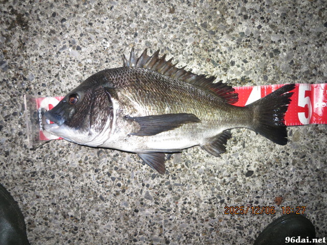 18:20 またしても同じ様なアタリ、合わせるよりも糸を張ってみると生体反応あり、ここで強く竿を煽ると魚が暴れだす。これを逃すとおそらくボウズあがりとなると思い慎重にやり取り、無事玉インしました。前回同様やり取り中に予測したよりもサイズは大きく、47cm 1.7kg 居着きの黒鯛でした。