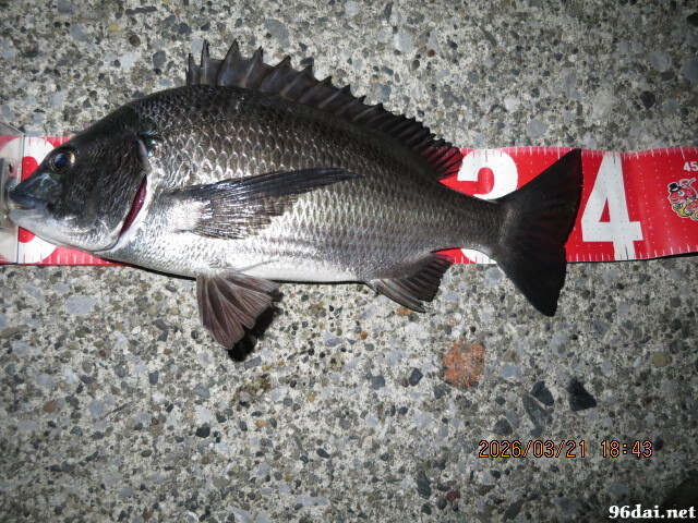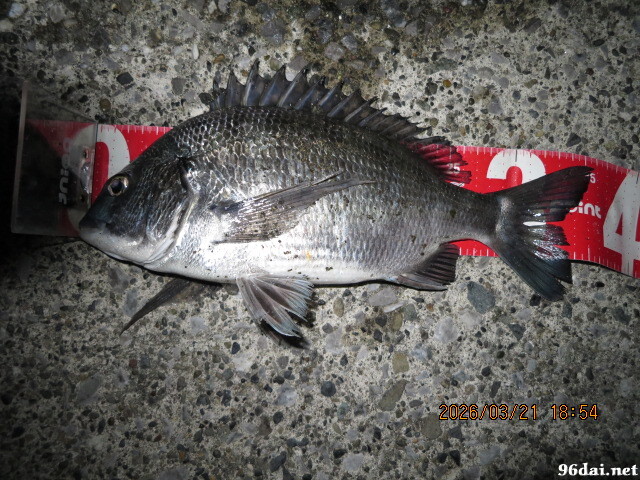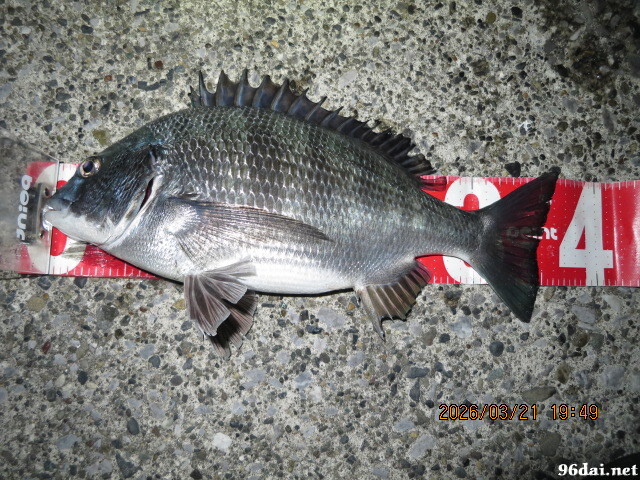 気配なし時間が続き、南寄りの風とはいえ、未だ夜の海は寒く、納竿が頭をよぎったが続けていたら19:45 明解なアタリで合せてヒット!同じようなサイズの36cm。今度は鱗が銀ピカ、腹ボテ、春の乗っ込み黒鯛でした。