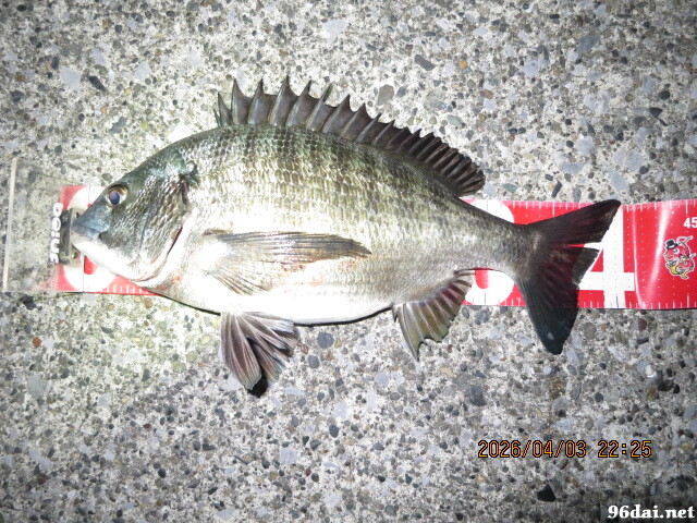 体型はもう放卵時期の乗っ込み体型、40cm1.3kgでした。針を外し、即写真撮影後は持続可能な黒鯛釣りの為即リリース!