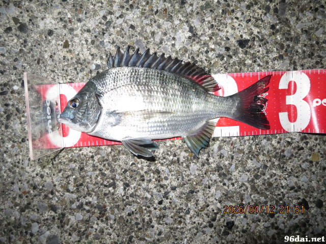 アタリゼロの時間帯が3時間近くになろうとした21:45本日最初のアタリは向こう合わせでやってきた。慌てて竿を勢いよく立てたので魚がすぐに浮き上がった。サイズは小さいがフグではない引き方。無事玉入れし、計測したらギリカイズの26cmでした。