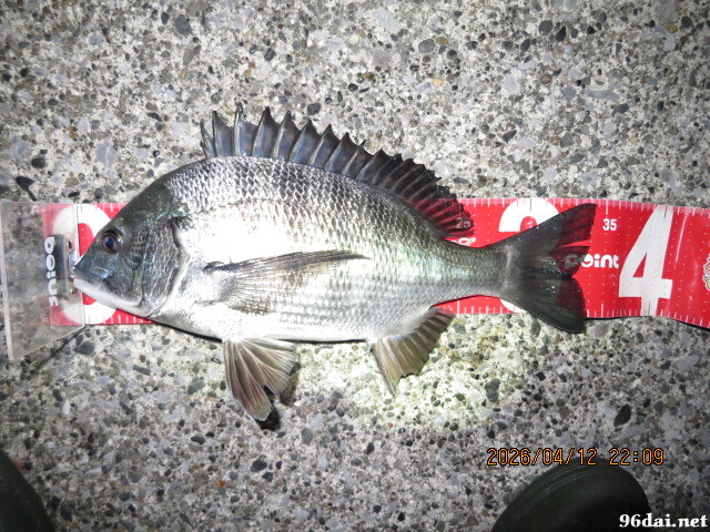 もう少し大きいのは釣れないか?と続けているとほどなくしてまたアタリ。今度はジャストな合わせでヒット。サイズアップは確信したが黒鯛と呼ぶには若干サイズ不足の34cmカイズでした。