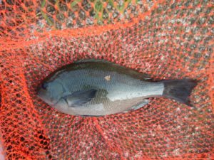 6:10、ウキが見えなくなるまで消し込んだのでアワセ、やっと掛かる。前回の穴に入られないようにして30cmのメジナをゲット。