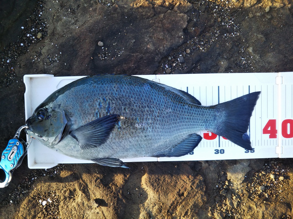 3:20、際の海藻に針が絡んだようなウキの入り、潮が動くとそのままウキも入っていく。アワセると根掛かりで動かない。やっぱり海藻に引っ掛かっていたんだと竿を強く持ち上げたら、あれ生体反応あり。急に動き始め一気に突っ込まれた。今日はハリス2号、ちょっと無理をしても大丈夫だろうと走りを止めて寄せに入る。魚はなんだろう、海面に浮いて暴れるが暗くて見えない。タモ入れして覗くと、やった!!メジナだ。多分際で食って際へ張り付いていたのだろう。サイズは37cm 0.98kg、40とキロには届かなかったが、暗い時間に狙って取った満足の一枚、とても嬉しい。