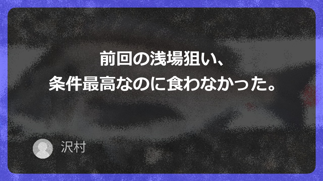 今回は釣座を変える、前回50UPの群れを見た周辺に釣座を取る。ここは手前には根があるがその先は広い砂地、砂地の落ち込み際を狙う事にした。