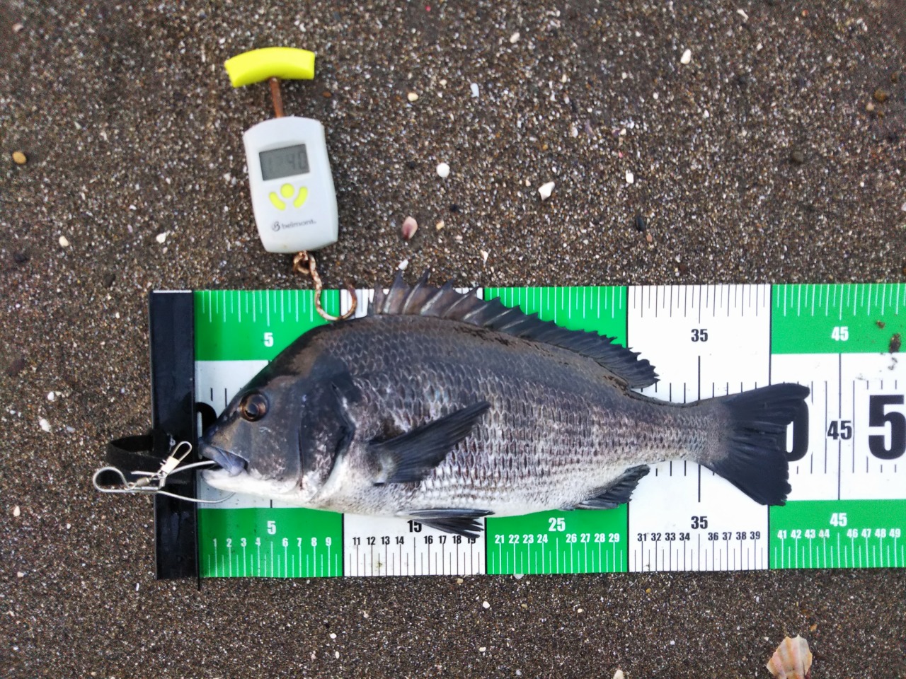 15:45、フグが消え始めた感触。サナギで一度モゾモゾしたが食い込まない。黒鯛の気配あり。ここはクリームダンゴに頼る事にする。15:50、クリームダンゴで一旦食い上げ、その後押さえ込み、ウキが動かない。これは食っていそう、でもまだ待つ。やっとウキが見えなくなりアワセてヒット。最初のゴンゴンの直後、いきなり走り出す。すごいパワー、ドラグが唸る。レバーブレーキに切り替えるがかなり走られた。また走った方面は根があり、先日はアイゴに切られている。根を交わすために私も走る、ゆっくり寄せに入る。波打ち際で一暴れ、なんとかタモに入った。43cm 1.24kgの黒鯛をゲットしました。いやぁパワフルな黒鯛でした。ドラグを緩めに調整しておいて良かったです。