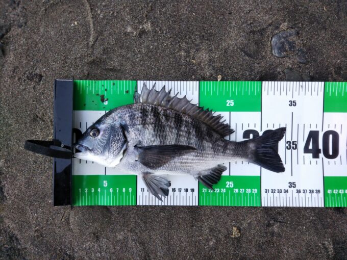 条件悪いが渚釣りへ、34cmのカイズをゲット。