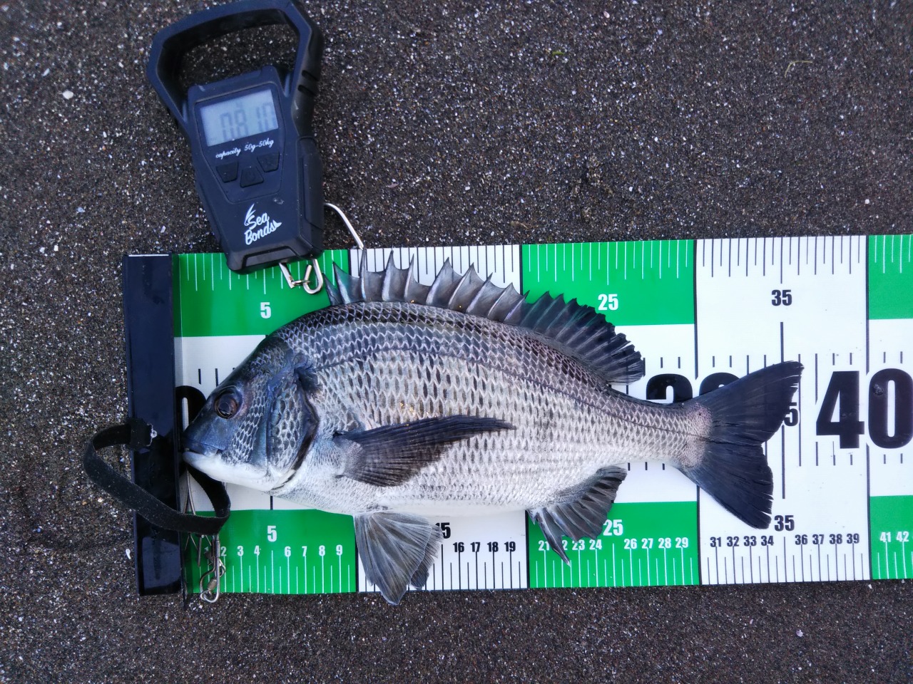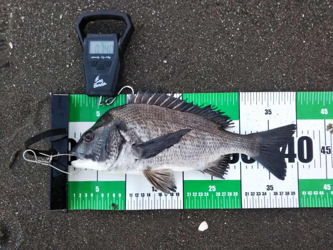 続くかと思ったがやはり食い込まないアタリ。16:10、オキアミをムキミにして針に付けてみた。モゾモゾ継続、押さえ込みで動かない。食っていると確信してアワセるとヒット。抵抗は強いが最初の黒鯛程ではない。慎重に寄せてタモ入れしたら最初のより大きい。40cm 0.74kgの黒鯛をゲット。これはちょっと痩せてたね、でも40が出たので満足。