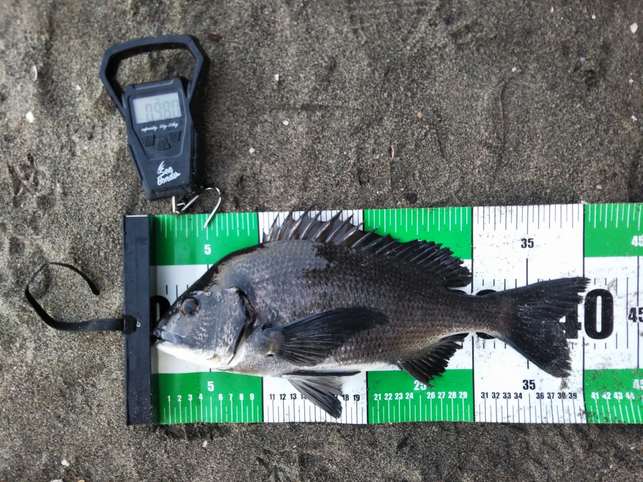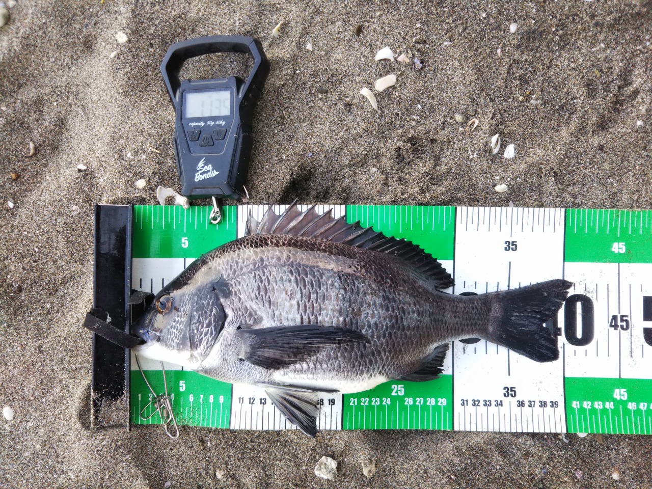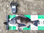 今日は2枚出たので満潮の16:30で上がろうと考えた。そうだ最後はクリームダンゴを試してみよう。16:20、最後の一投、すると押さえ込みで動かない、10秒近くサスペンドしたまま。アワセは早いと思ったけどアワセてヒット。これもすぐ黒鯛と分かる引き、慎重に寄せてタモ入れ、40.5cm 0.98kgの黒鯛をゲットしました。やはりあのアタリで唇の皮1枚の針掛かり、咥えてただけだった。これは掛かりも浅いし、痩せていたのでリリースとしました。今日はここで終了としました。