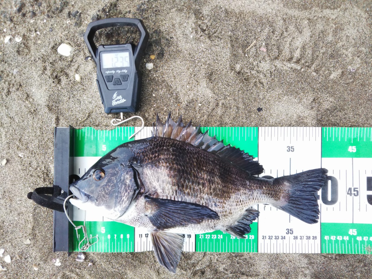 クサフグも湧き始め、オキアミで掛かる。何故かエビダンゴは残っている。15:15、急にオキアミが残り始めた。黒鯛の気配だと思う。一度エビダンゴでモゾモゾ出たが食い込まない。15:20、オキアミで流すとモゾモゾ、ウキの上下動がある。そしてゆっくりとウキが入る。アワセると重いだけ、これはまた馬鹿でかいヒガンフグだろうと思った。少し寄せて海面で暴れる。黒鯛の姿が見え、ここから急に引き始める。もう半分寄っているので走られなかった。タモ入れして41cm 1.23kgの黒鯛をゲット。頭と胴体が大きく、ちょっと奇形っぽい魚体だった。刺し身は無理でも他の食べ方ならいけるはず、キープしておく。